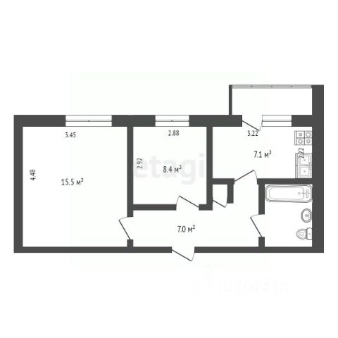 При желании можно сделать перепланировку и "двушку" перекроить в "трешку" с отдельными входами: маленькую комнату можно увеличить за счет "кладовки" и поделить на две части, кратно двум окнам. Небольшой размер прихожей, с двумя входами, можно легко увеличить: продолжить коридор за счет большой комнаты и установить раздвижные прозрачные двери.