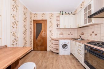 Кухонный гарнитур - пластиковый, продумано все, есть место для посудомоечной машины, ниша под холодильник 50 см, позволила высвободить место для обеденной группы. Стиральная машина размещается в кухне для экономии места в ванной комнате.
