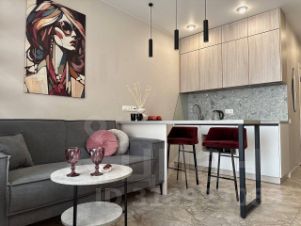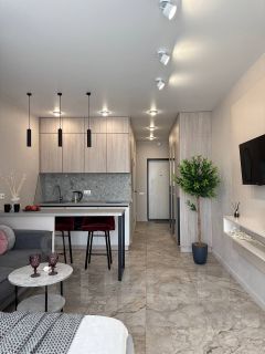 Полностью меблирована, есть всё для комфортного проживания: двуспальная кровать, диван, телевизор.