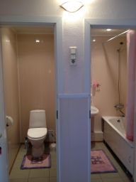 В ванной: ванна, туалет, раковина, средства личной гигиены, набор полотенец, тапочки.