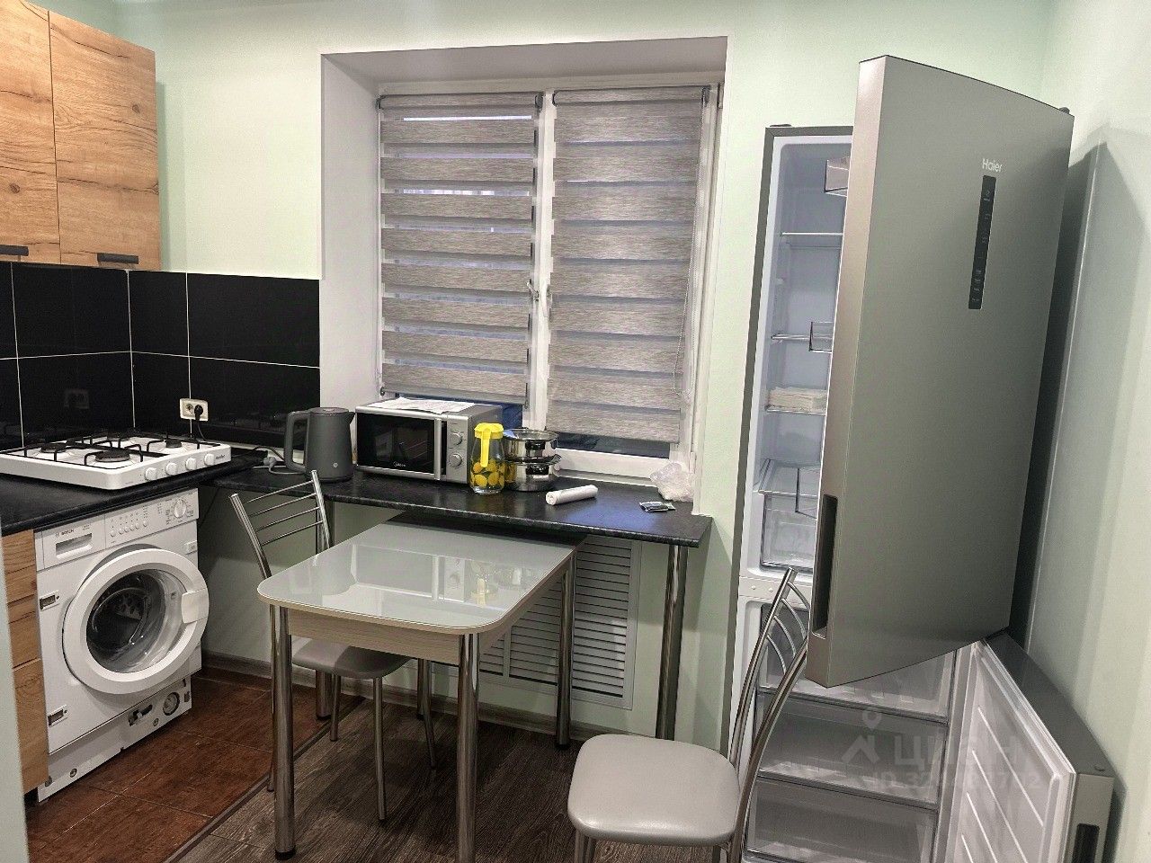 отдельная кухня с техникой (холодильник, плита, микроволновка, чайник);