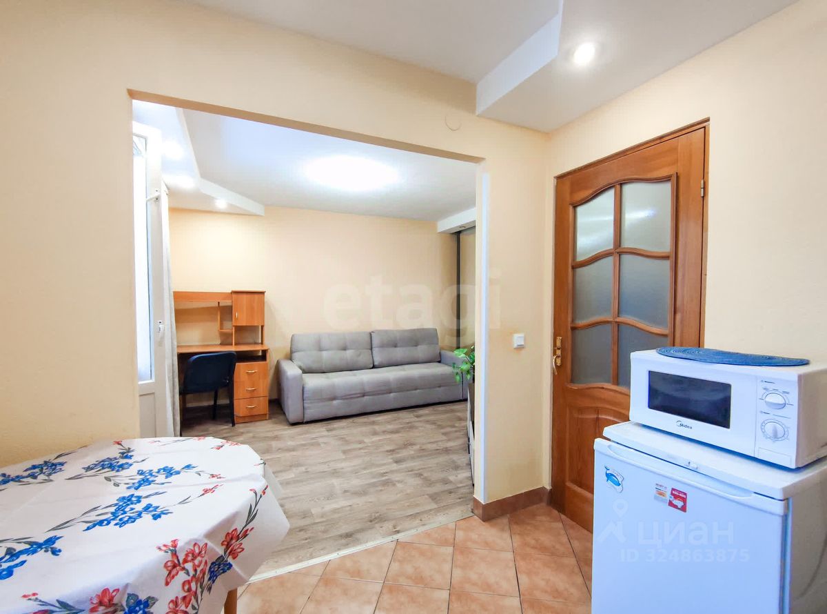 Квартира полностью укомплектована всем необходимым для проживания: диван, вместительный шкаф, стиральная машина, холодильник, микроволновая печь.