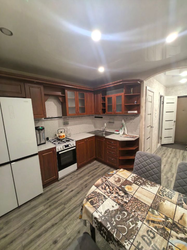 Кухня просторная, оснащена современной мебелью и техникой, включая плиту и духовой шкаф, термопот и микроволновую печь. Санузел раздельный, есть водонагреватель на 30 литров.