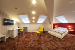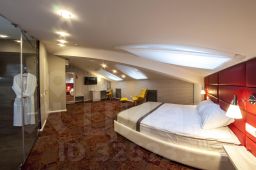 Двухместный номер категории "комфорт", площадью 30 м², расположен на мансардном этаже отеля. Подходит как для одноместного так и для двухместного прожавания. В номере двуспальная кровать 160*200 см, рабочий стол, вместительный шкаф для одежды, телевизор, холодильник, интернет Wi-Fi, телефон, ванная комната: ванна ждакузи, фен, комплект полотенец, халат, полный комплект гостиничной парфюмерии.