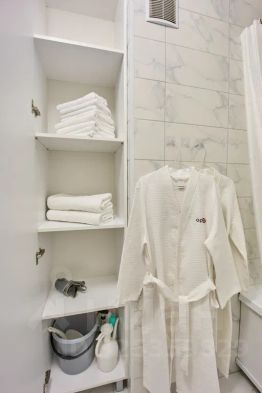 Опрятную и просторную ванную комнату + свежие полотенца.