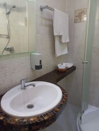 Ванная комната: душевая кабина, фен, комплект полотенец, халат, полный комплект гостиничной парфюмерии.