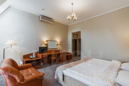 Номера класса Студио Twin - просторные двухместные номера, рассчитанные на гостей, ценящих комфорт и пространство. В номере - вместительный шкаф-купе, удобный диван, журнальный столик, кресла, большой рабочий стол, две кровати размером 110*200. Ванная комната оборудована современной сантехникой, имеется фен и все необходимые текстильные и косметические принадлежности. Оснащение номера: кондиционеры, кабельное телевидение, минибар, телефоны с возможностью междугородной и международной связи, Интернет Wi-Fi, цифровой сейф. Общая площадь номера: 36,6 кв.м.