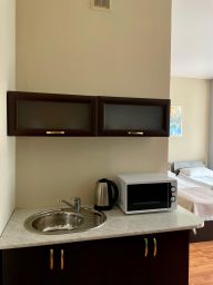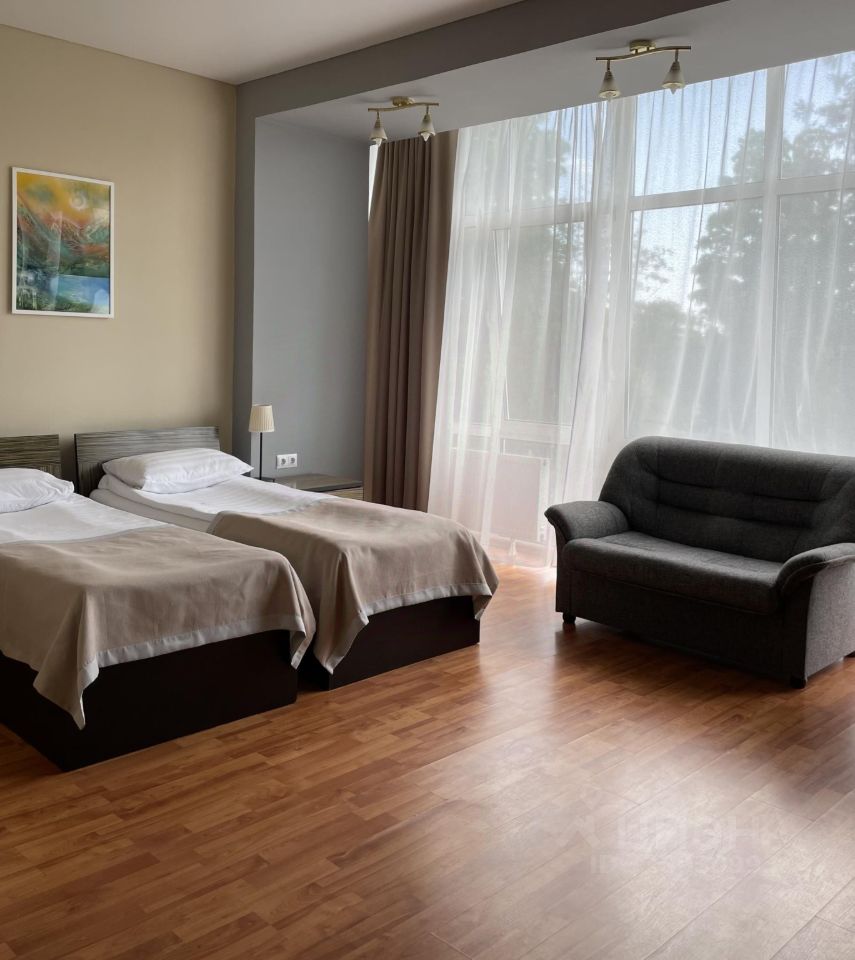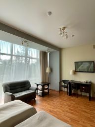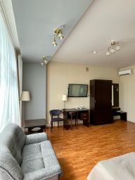 Однокомнатный. Номер оборудован ванной комнатой, телевизором, холодильником, двумя односпальными кроватями, диваном, кондиционером, феном, телефоном, кухонным уголком.