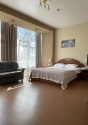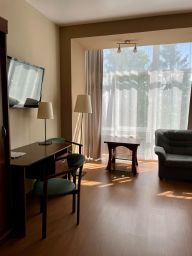 Номер оборудован ванной комнатой, телевизором, холодильником, одной двуспальной кроватью, диваном, кондиционером, кухонным уголком, телефоном, феном, халатом и тапочками.