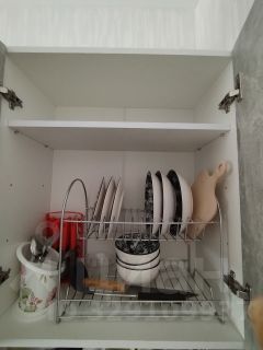 Мебель и техника на кухне: кухонный гарнитур, холодильник, микроволновка, электрический чайник, вся необходимая посуда.