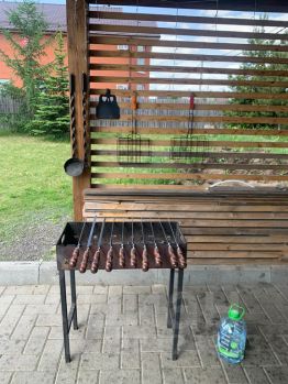 На улице крытая терраса, с мебелью и мангальной зоной. К мангалу шампуры, решетка.