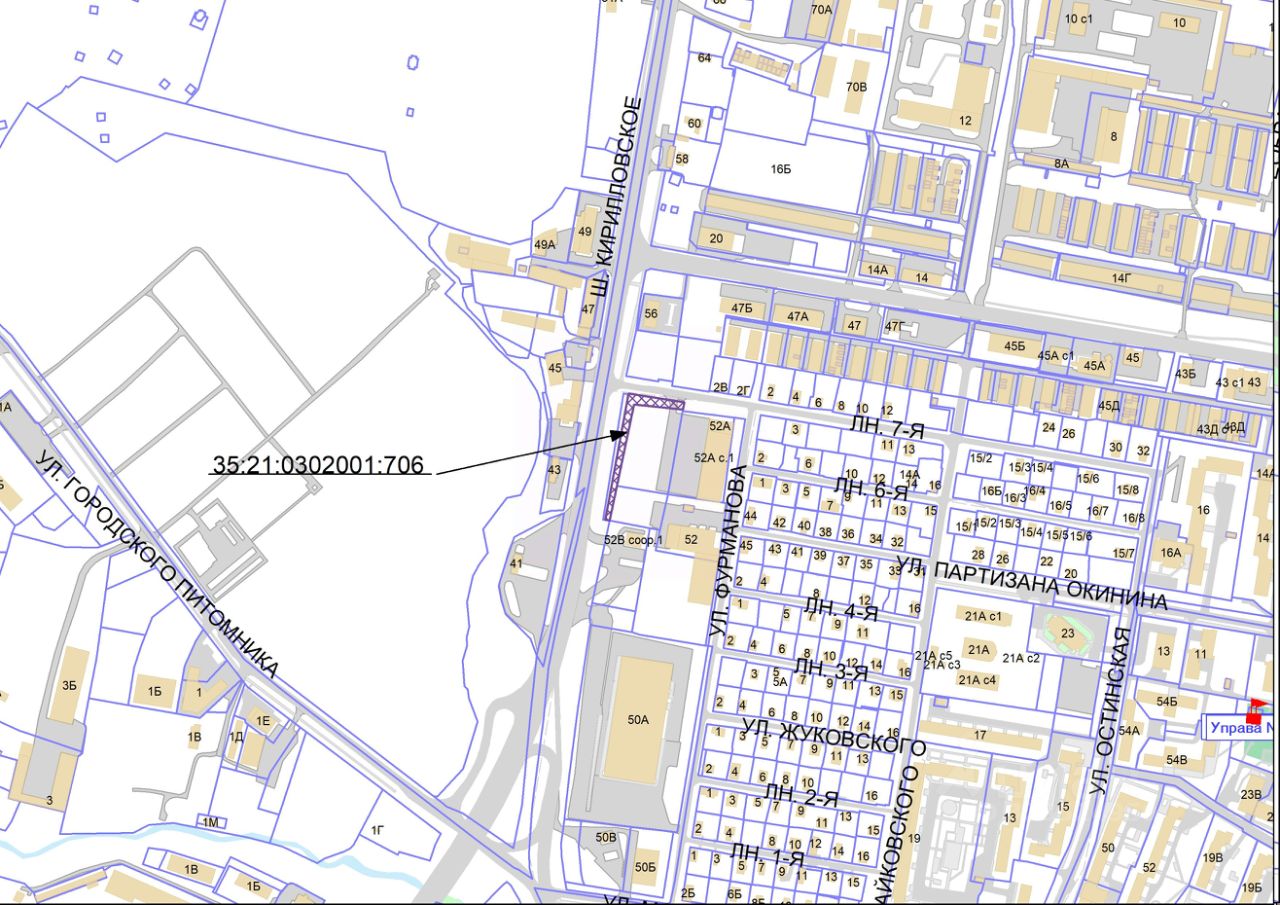 Земельный участок с кадастровым номером 35:21:0302001:706 площадью 1330 кв. м, категория земель - земли населенных пунктов, разрешенное использование: благоустройство территории, местоположение: Вологодская область, г. Череповец, ш. Кирилловское.