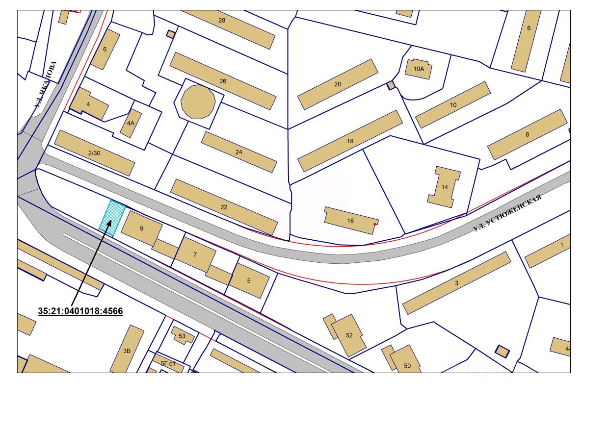 Земельный участок с кадастровым номером 35:21:0401018:4566 площадью 344 кв. м, категория земель - земли населенных пунктов, разрешенное использование: благоустройство территории, местоположение: Российская Федерация, Вологодская область, город Череповец, ул. Устюженская.