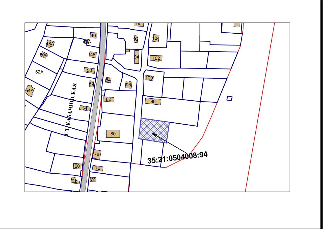 Земельный участок с кадастровым номером 35:21:0504008:94 площадью 1287 кв. м, категория земель - земли населенных пунктов, разрешенное использование: для индивидуального жилищного строительства, местоположение: Российская Федерация, Вологодская область, городской округ город Череповец, г. Череповец, ул. Кабачинская.