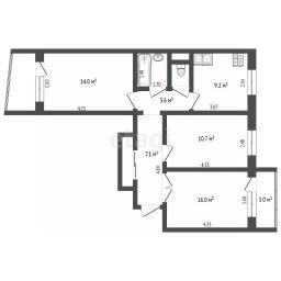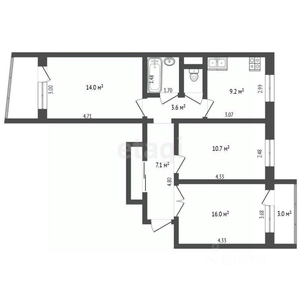 Три раздельные комнаты позволят с комфортом разместиться семье с детьми или людям, работающим удаленно из дома. Кухня 9м2 правильной квадратной формы обеспечит удобство для приготовления и возможность собрать за столом семью и гостей.
