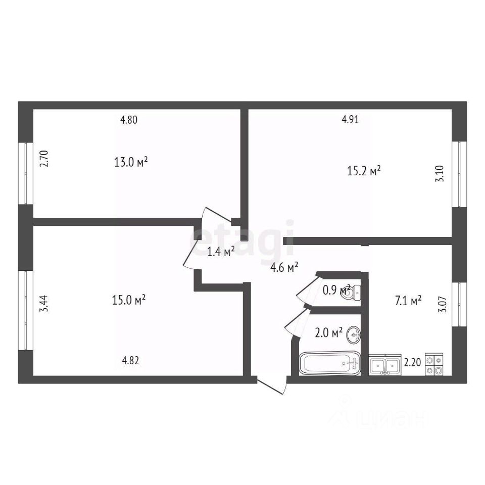 Квартира общей площадью 59,2 кв.м состоит из трех изолированных комнат: