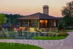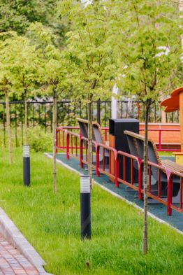 Бордюры выполняются в одной отметке с дорожками и газонами. Мы уделяем большое внимание эко-зоне, поэтому проект предусматривает работы профессиональных ландшафтных дизайнеров с высадкой деревьев и кустарников, а также уходом за растениями в течение года после сдачи дома. Основная доминанта двора - кирпичная беседка, там жители смогут организовывать праздники, отмечать важные события в своей жизни, готовить мясо в зоне барбекю и просто общаться друг с другом.