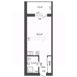 Практичная планировка грамотно организована: функциональная кухонная зона оборудована стильной барной стойкой, которая служит удобным разделением между пространством для приготовления пищи и отдыха. В санузле установлена современная душевая кабина с полноценной кафельной отделкой и новая сантехника. Напольное покрытие — ламинат, отличающийся долговечностью и простотой в уходе.