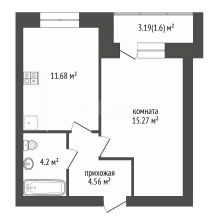 Планировка квартиры отличается рациональностью: изолированная комната 15 кв.м с функциональной нишей позволяет зонировать пространство на спальную и гостиную зоны. Кухня площадью 11,7 кв.м обеспечивает достаточное пространство для организации обеденной группы и хранения.