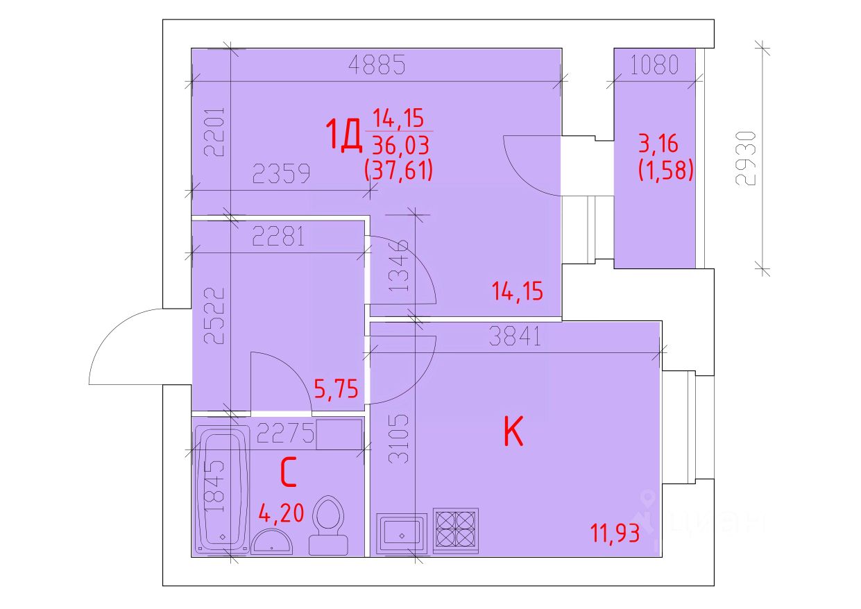 Продаётся 1-комнатная квартира в строящемся доме (Дом 23 - 2 этап), срок сдачи: IV-кв. 2026, общей площадью 37.61 кв.м., на 2 этаже.