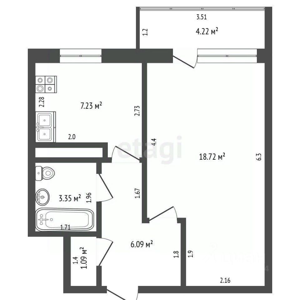 - Потолки 2,5 метра, кухня-7,23 кв.м, комната-18,72 кв.м, просторная прихожая с гардеробной-1,09 кв.м.