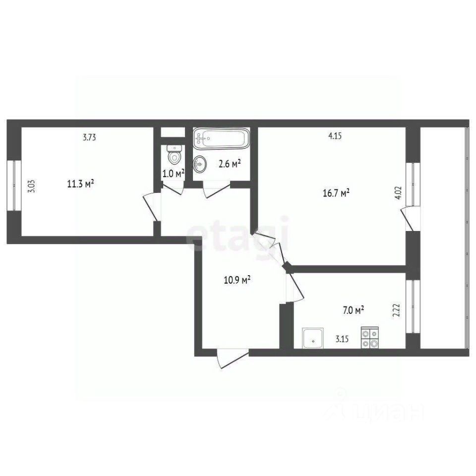Планировка отличается рациональностью: изолированные комнаты расположены по разные стороны, что обеспечивает приватность, а большая лоджия служит дополнительным функциональным пространством.