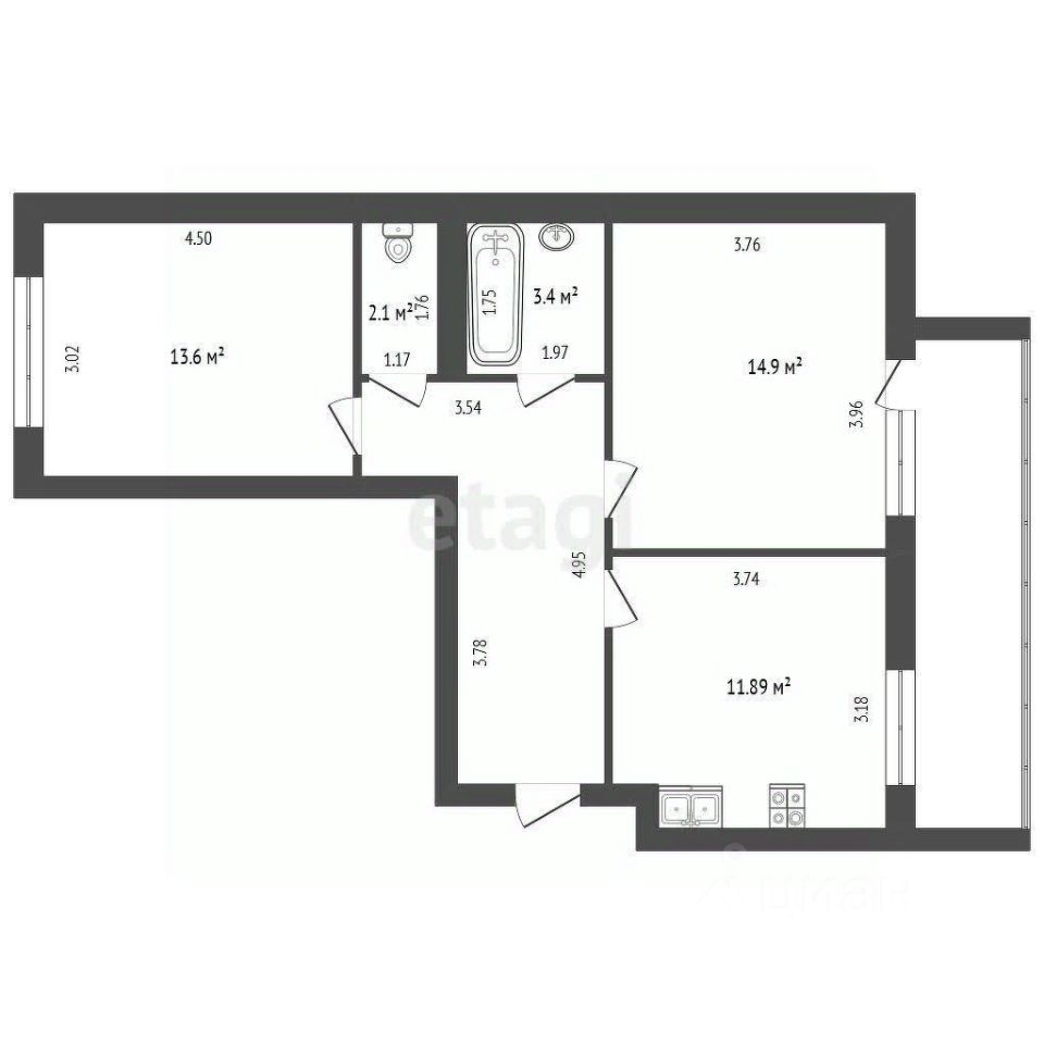 Отличная планировка - комнаты и кухня правильной формы. Метраж кухни 11,89 кв.м. позволит спланировать кухню-гостиную, а комнаты 14,89 и 13,59 отлично подойдут для организации спальных комнат.