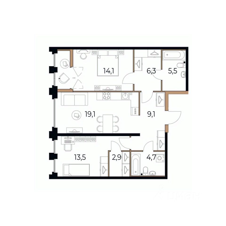 Площадь кухни19,1 м²