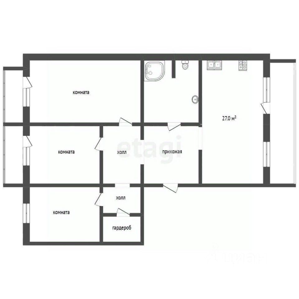 Три изолированные комнаты обеспечивают приватность для всех членов семьи, а объединенная кухня-гостиная служит комфортным пространством для совместного времяпрепровождения.