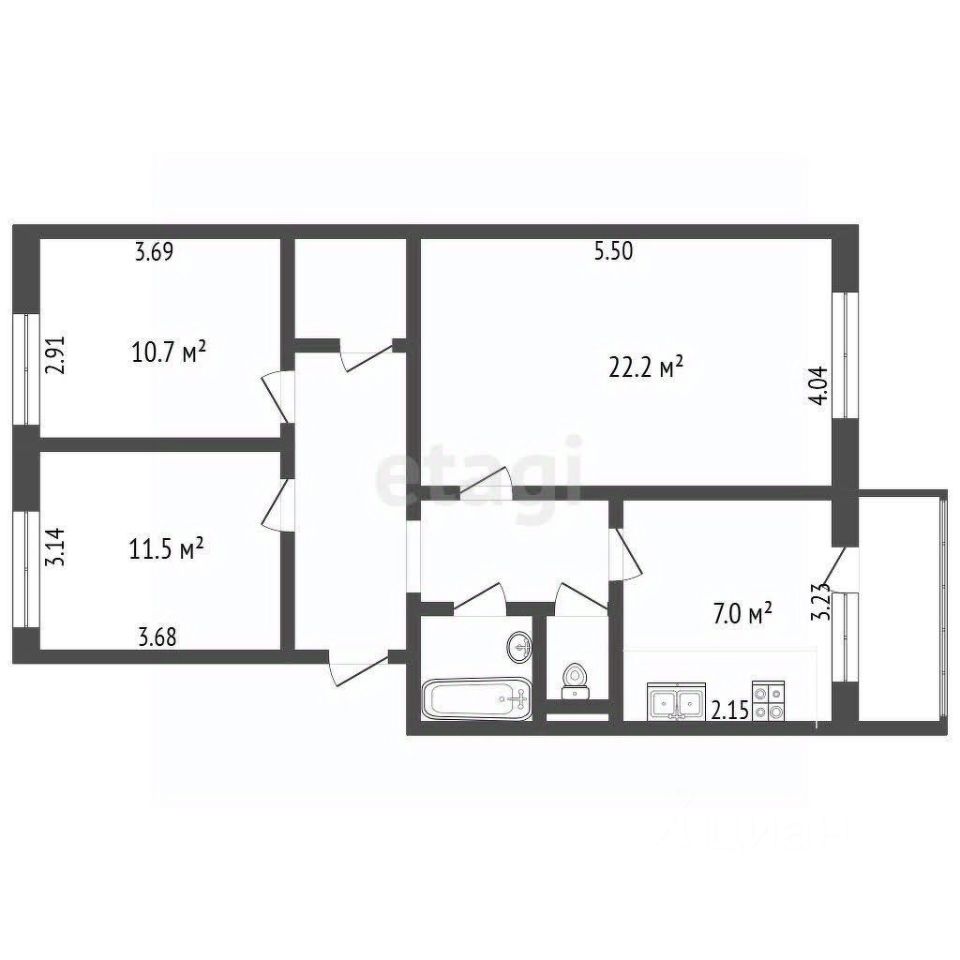 Планировка продумана для комфортной жизни семьи — три изолированные комнаты обеспечивают приватность, а общая площадь позволяет удобно разместить мебель и зоны хранения.