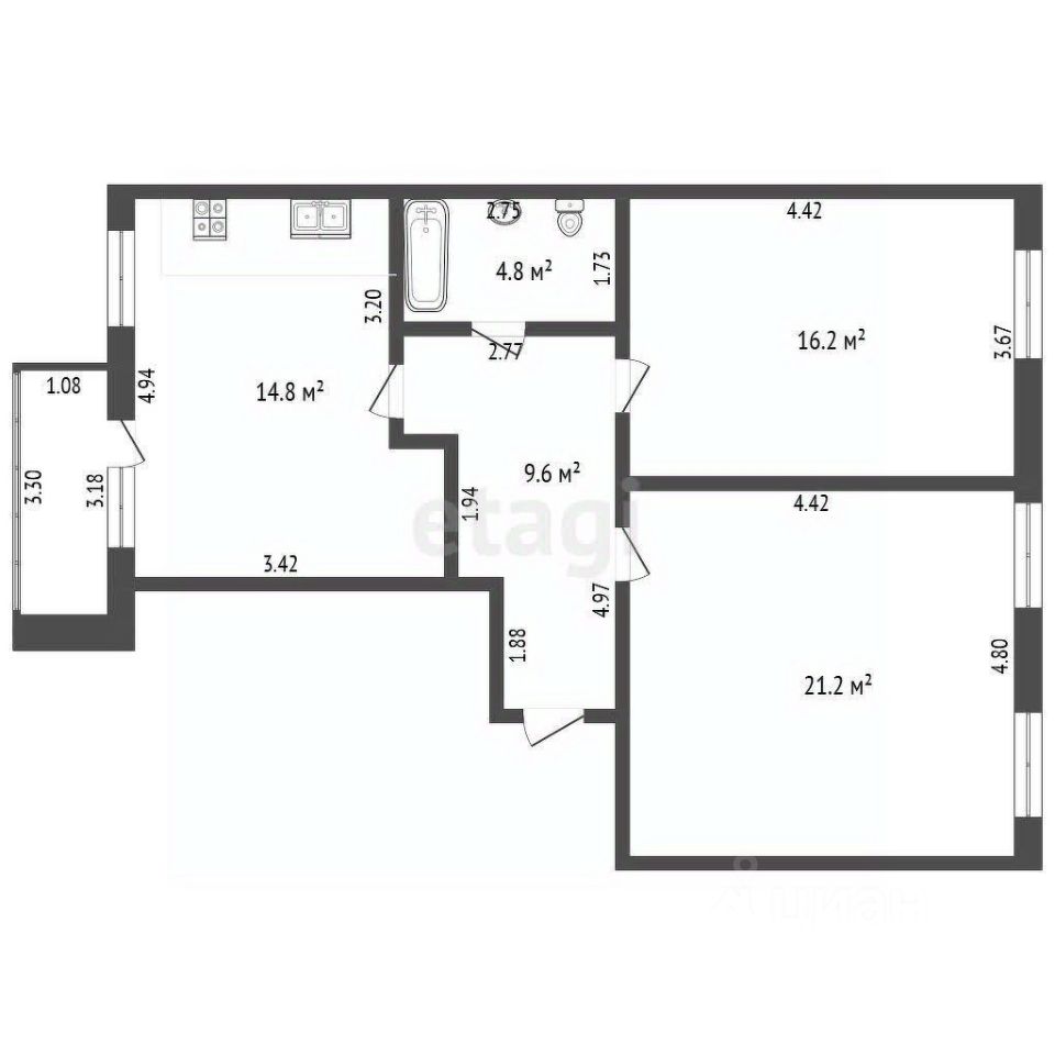 Две раздельные комнаты правильной прямоугольной формы позволяют максимально эффективно использовать каждый квадратный метр и облегчить расстановку мебели.