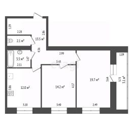 - Комфортные жилые зоны: две изолированные комнаты площадью 19,7 м² и 14,2 м², позволяющие каждому члену семьи иметь собственное пространство.