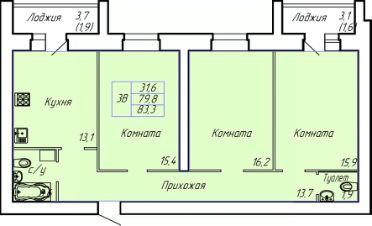 Продаётся 3-комнатная квартира в строящемся доме (1 этап), срок сдачи: IV-кв. 2027, общей площадью 83.3 кв.м., на 2 этаже.