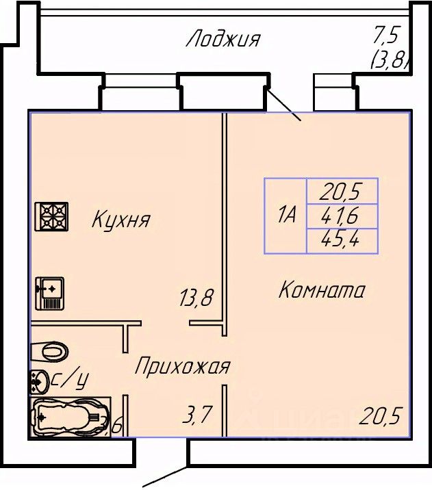 Продаётся 1-комнатная квартира в строящемся доме (1 этап), срок сдачи: IV-кв. 2027, общей площадью 45.4 кв.м., на 6 этаже.