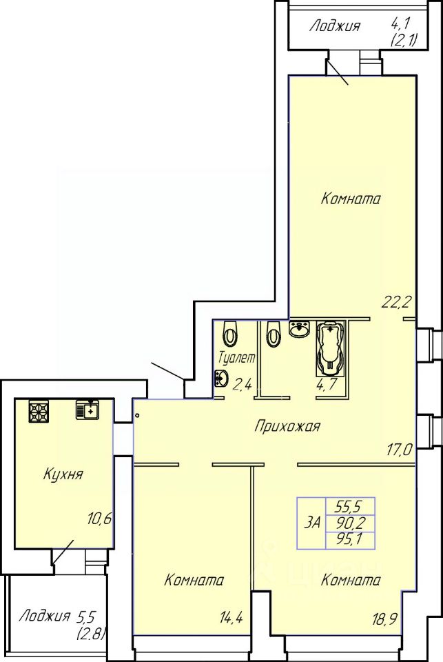 Продаётся 3-комнатная квартира в строящемся доме (1 этап), срок сдачи: IV-кв. 2027, общей площадью 95.1 кв.м., на 5 этаже.