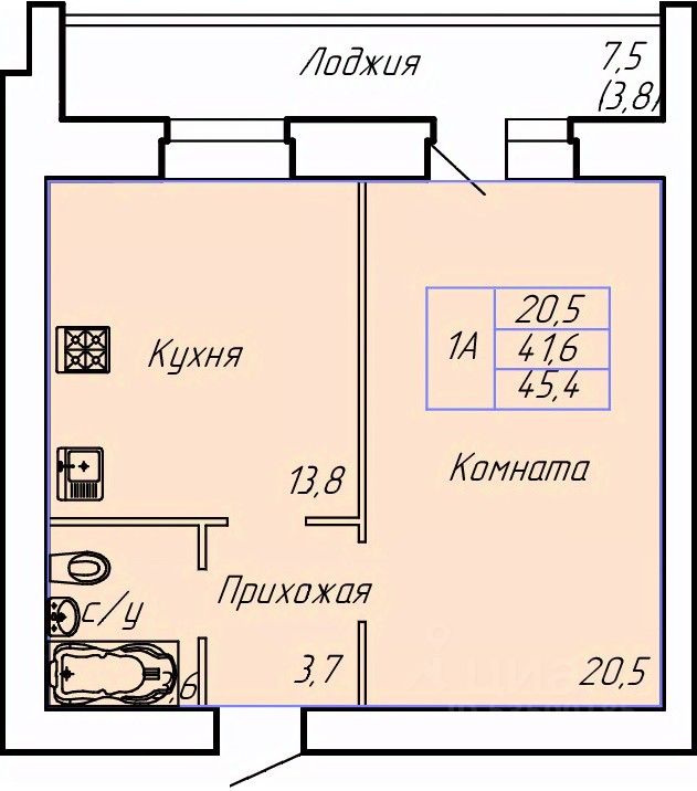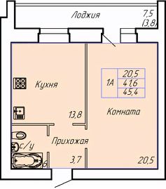 Продаётся 1-комнатная квартира в строящемся доме (1 этап), срок сдачи: IV-кв. 2027, общей площадью 45.4 кв.м., на 1 этаже.