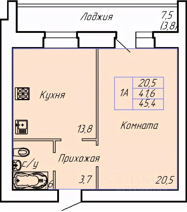 Продаётся 1-комнатная квартира в строящемся доме (1 этап), срок сдачи: IV-кв. 2027, общей площадью 45.4 кв.м., на 4 этаже.
