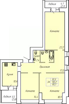 Продаётся 3-комнатная квартира в строящемся доме (1 этап), срок сдачи: IV-кв. 2027, общей площадью 95.1 кв.м., на 7 этаже.