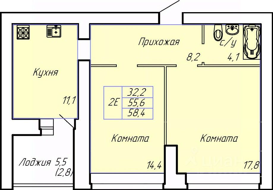 Продаётся 2-комнатная квартира в строящемся доме (1 этап), срок сдачи: IV-кв. 2027, общей площадью 58.4 кв.м., на 5 этаже.