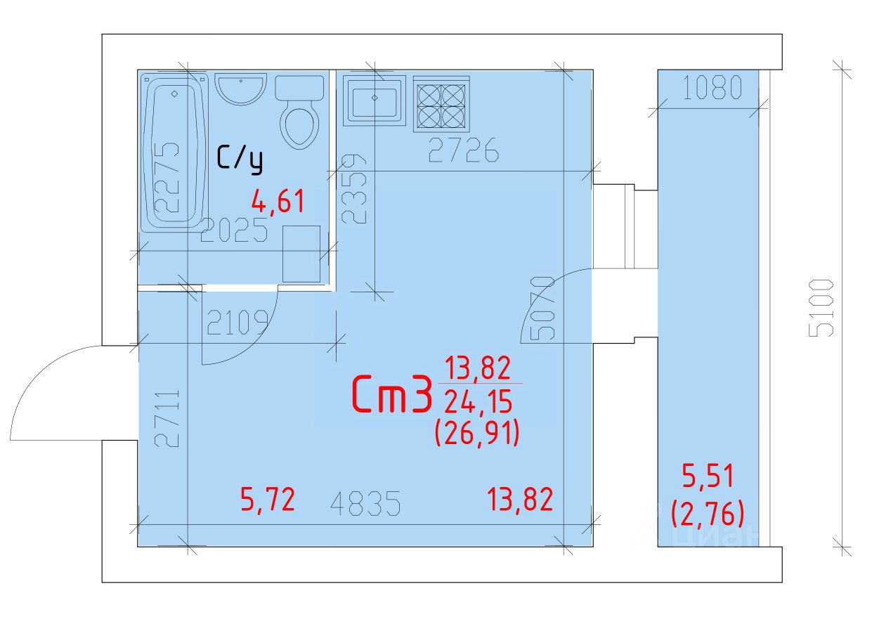 Студия, 26,91 м²