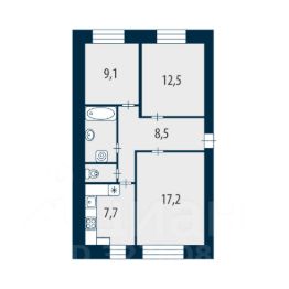 Общая площадь 60,6 м². Три раздельные комнаты: гостиная 17,2 м² + две спальни 12.5м² и 9,1м². Кухня 7.7 м² оборудована гарнитуром. Просторная ванная комната.