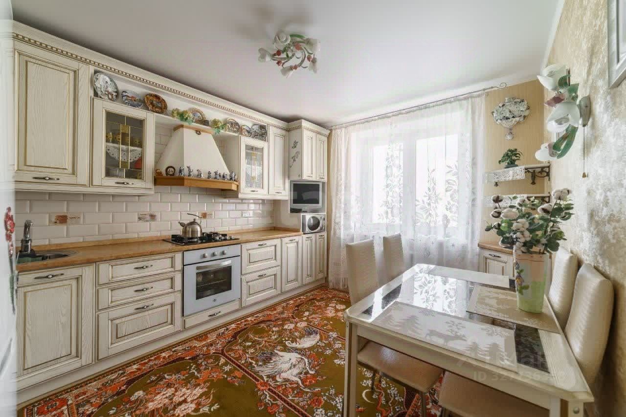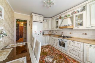 Кухня: Оснащена стильным гарнитуром класса "классика" с итальянскими фасадами из натурального дерева. В тон гарнитуру подобраны стол и 4 стула. Вся техника остается: холодильник, варочная поверхность, электрический духовой шкаф, телевизор и микроволновая печь.