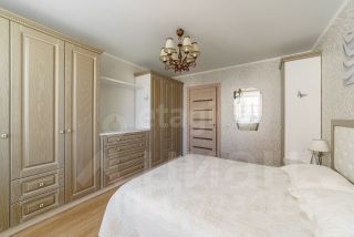 Спальня: Просторный гарнитур из натурального шпона благородного оттенка с множеством мест для хранения. Установлена двуспальная кровать с ортопедическим матрасом.