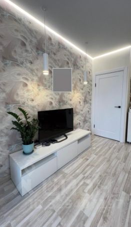в комнате парящий натяжной потолок, несколько вариантов освещения;